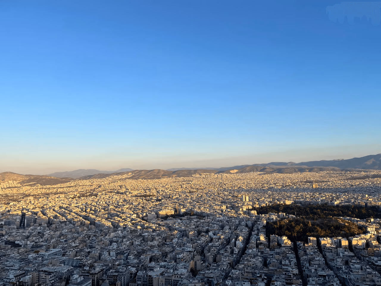 From the summit, you can see how the Acropolis sits within the broader Athens basin — surrounded by modern city, flanked by other hills, with the Aegean Sea stretching beyond. It's the perspective that puts the Acropolis in its full geographic context.